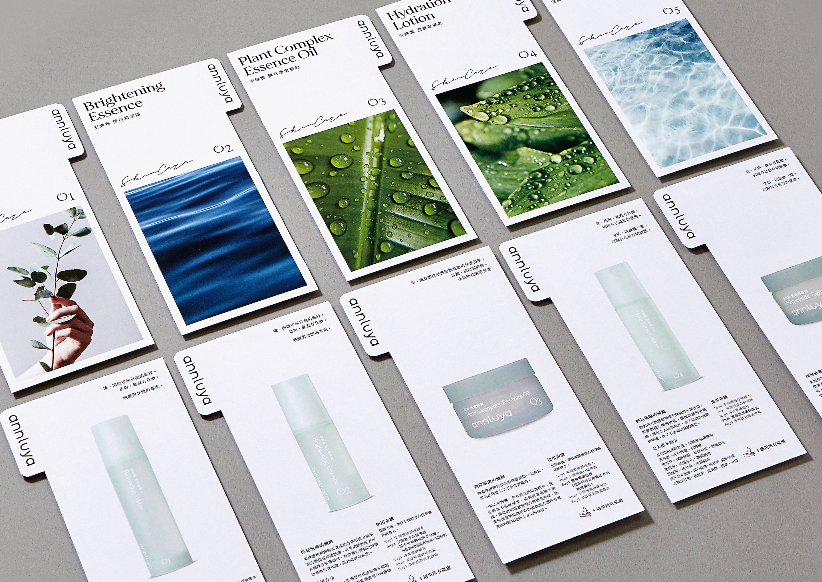 安綠雅品牌形象延伸規劃設計。產品主軸在水分子吸收力與植物的全素植萃保養品,因此品牌調性呈現以清新的感覺,搭配簡約的品牌主色,呼應產品的概念特色。整體設計著重表現品牌的自然原貌與簡約時尚,呼應品牌純粹保養融入生活感美學的品牌初衷。