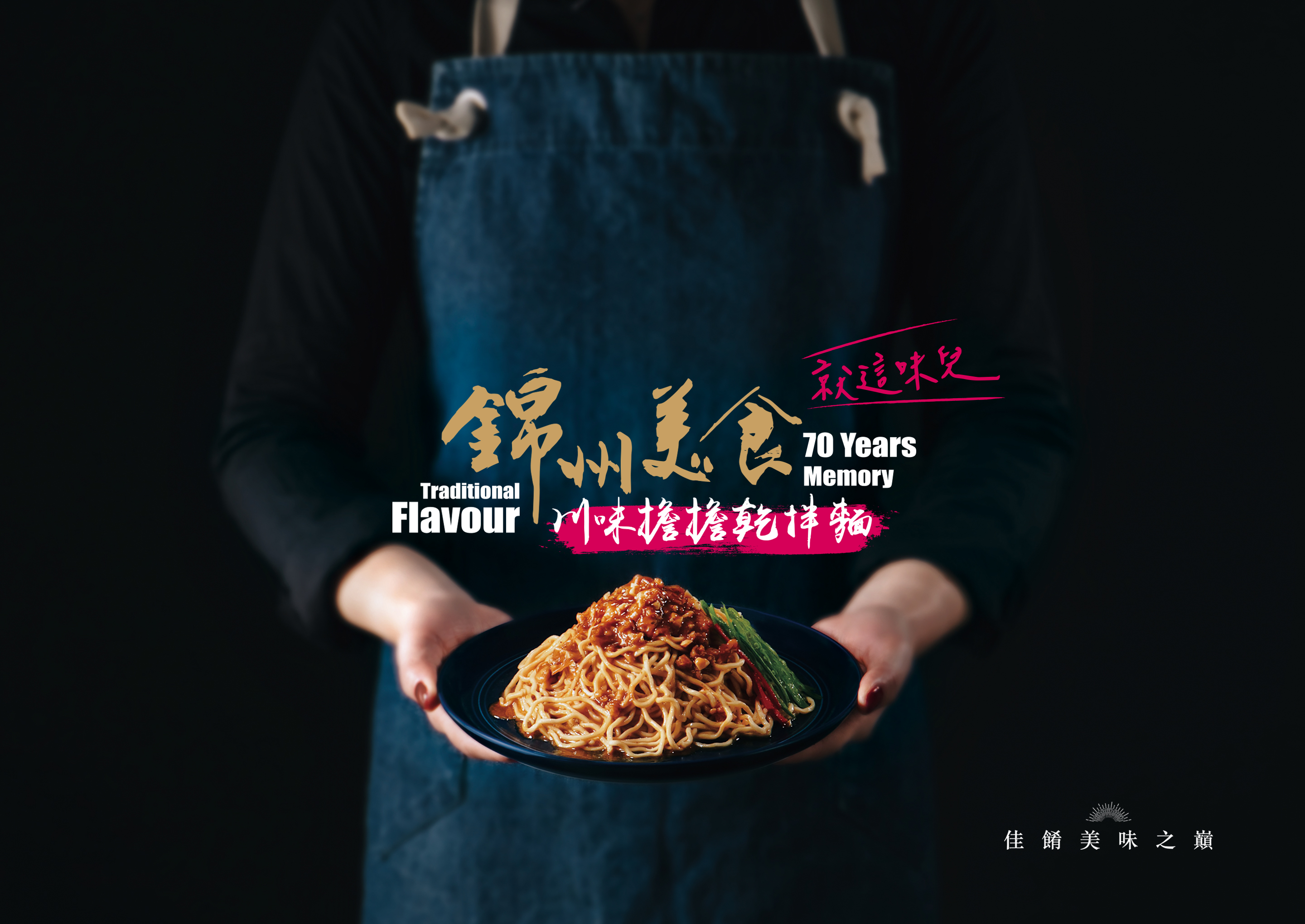 錦州美食就這味兒包裝設計。為傳達「錦州美食、經典麵食」的系列風格,背景以黑色為主色調,配合閃耀的錦州美食金字主視覺,表現本產品的風味高度。影像風格與產品口味色彩計畫,則是考量通路貨架上的辨識度與視覺指引,以利通路上銷售時與選購時的陳列識別性,整體包裝設計傳達出三個口味乾拌麵產品高度與風味質感,呼應佳餚美味之巔的產品訴求。